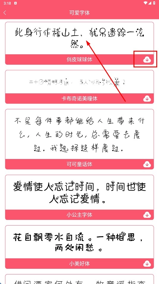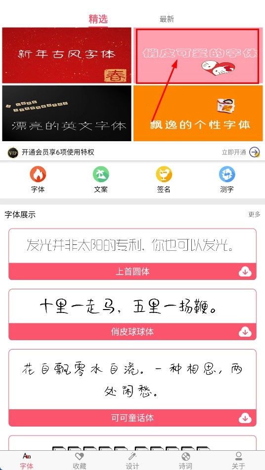 在首页能够选择不同风格的字体分类,比如点击【俏皮可爱的字体-分类标签】,就能进入可爱字体页面。