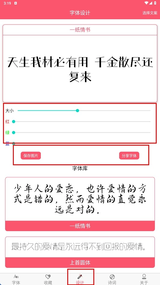 3、点击底部的【设计-功能按钮】,进入字体设计界面,在这里可以对字体的大小、颜色等参数进行调整,并且能够保存生成的图片或者分享该字体。