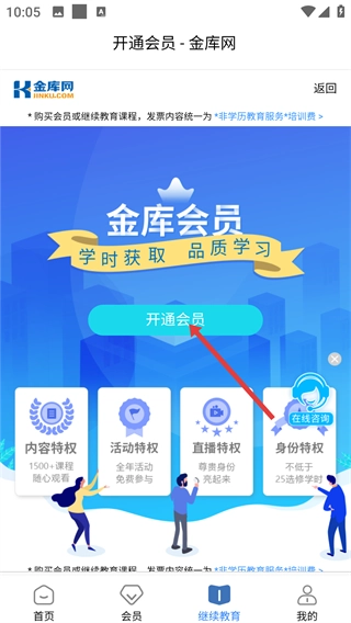 1、在金库网首页底部找到并点击【继续教育】按钮,进入继续教育板块后,即可查看会员课程等相关内容。