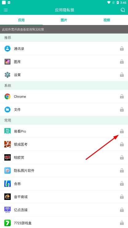 3、进入应用隐私锁页面后,找到目标应用旁的锁形图标(例如【易看Pro-应用】对应的锁),点击该图标即可完成应用隐私锁的设置。