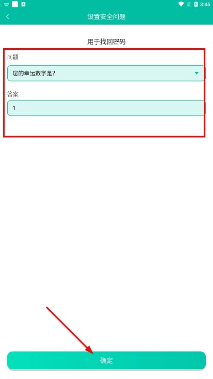 2、进入设置安全问题的页面,选择问题并填写好答案后,点击【确定】功能按钮。