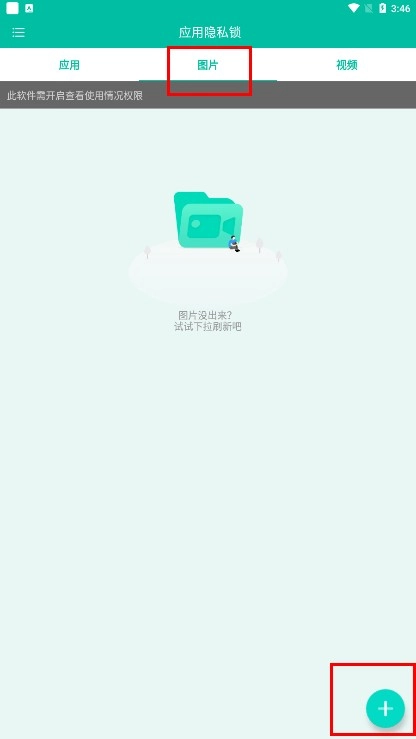 4、点击【图片-功能标签】,进入图片隐私锁页面后,可通过点击右下角的【添加功能按钮】来添加图片。