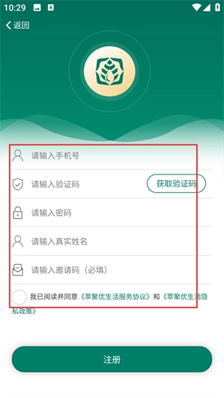 4、进入注册界面后,按顺序填写手机号、验证码、密码、真实姓名和邀请码,接着点击【注册】按钮,就能完成注册流程。