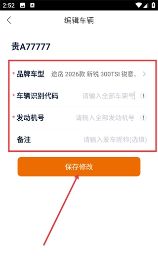 4、进入车辆编辑页面后,填写品牌车型、车辆识别代码、发动机号等相关信息,随后点击【保存修改】按钮,即可完成车辆信息的编辑操作。