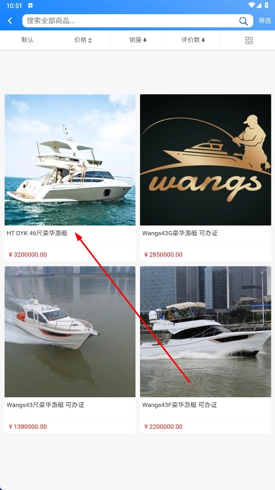 3、在商品列表中,点击目标游艇商品,例如【HT-DYK-46尺豪华游艇-商品卡片】,即可进入该商品的详情页面。
