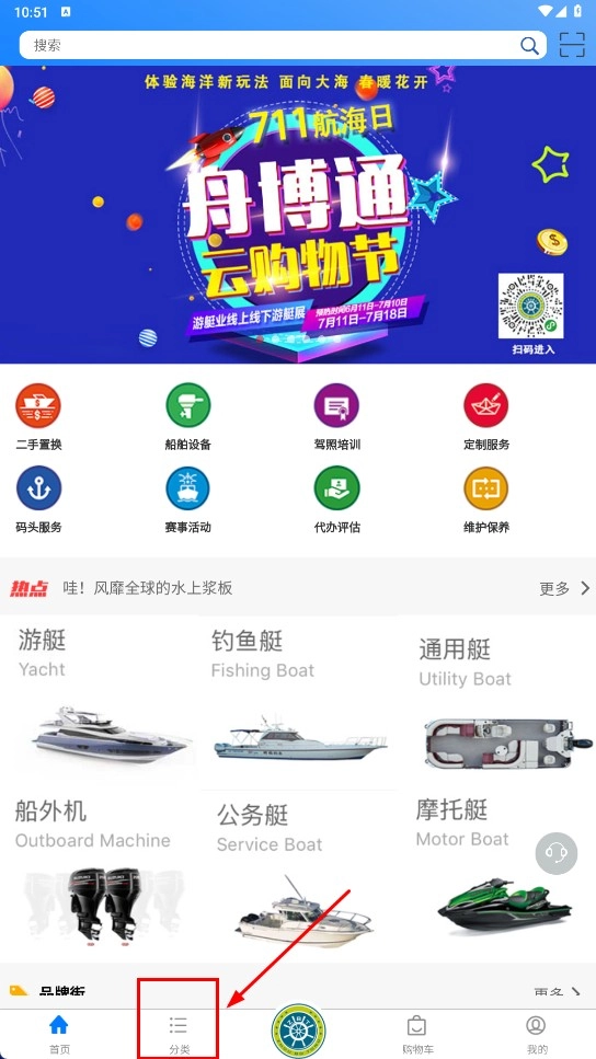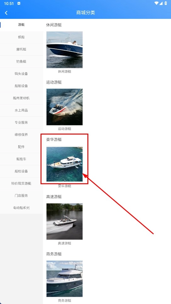 在商城的分类页面中,找到并点击【豪华游艇】分类选项,即可浏览该分类下的相关游艇商品。
