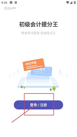 1、启动【初级会计提分王】应用,找到并点击【登录/注册】按钮,随后进入登录环节。
