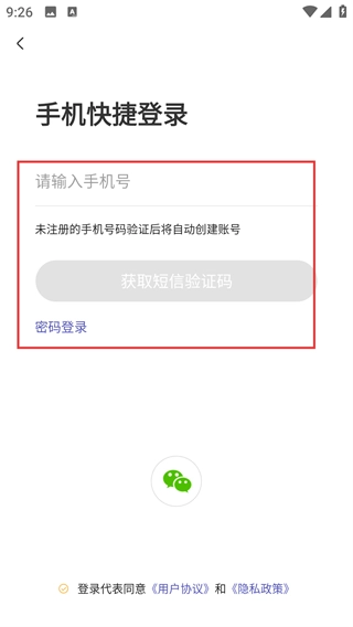 2、进入【手机快捷登录】页面,填写手机号并点击【获取短信验证码】,若该手机号未注册,验证通过后将自动创建账号。