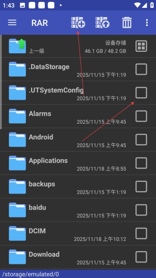 1、打开RAR界面后选择目标文件夹,接着点击顶部的压缩按钮,进入压缩选项页面。