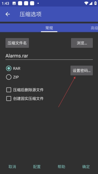 2、在压缩选项页面,点击【设置密码】按钮,即可进入密码输入的操作界面。
