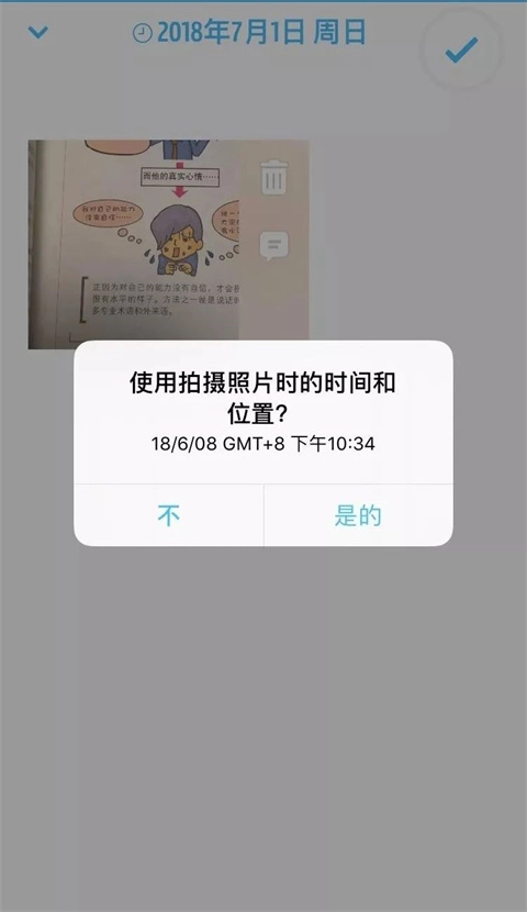 除此之外,照片还能按照拍摄当天的时间直接上传,就像下面这张图展示的那样。这一设计充分考虑到用户可能在当天无暇记录,同时又能避免他们特意去查看照片的拍摄时间。要是用户选择用过去的时间写日记,App还会自动搜索当时的天气、手机记录的步数等信息,防止用户因延迟记录而丢失这些数据,显得十分贴心。