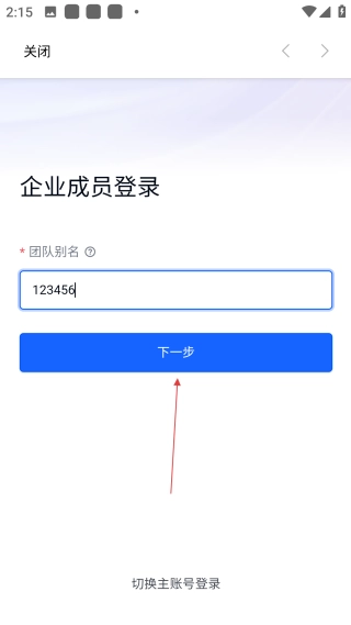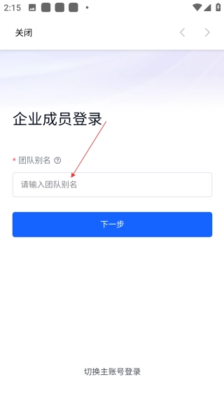 3、在企业成员登录页面的输入框内,填写【对应的团队别名信息】。