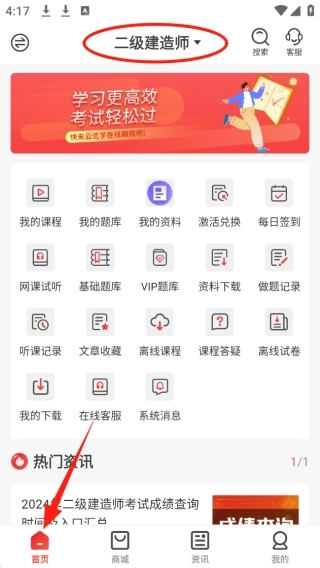 1、进入首页后,顶部区域可随时切换考试类别,首页内整合了你的各类课程与题库资源。