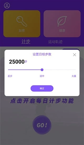 3.开启前要先设置目标步数,你可以通过滑动的方式挑选合适的数值,选好之后点击“确定”按钮来保存设置。