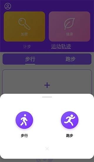 5.可点击上方切换到“运动轨迹”页面,接着点击右侧的“+”号,选择步行、跑步等运动类型。