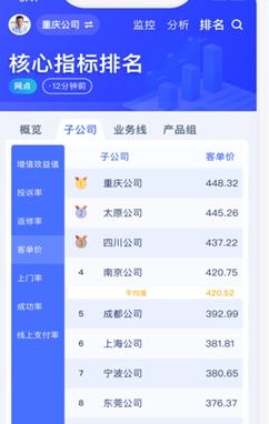 2.在排名概览板块,能够依据子公司、业务线、产品组等维度开展数据筛选操作