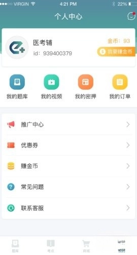 6、在“我的”页面,用户能够选择推广中心、赚金币、优惠券、常见问题等功能来使用。