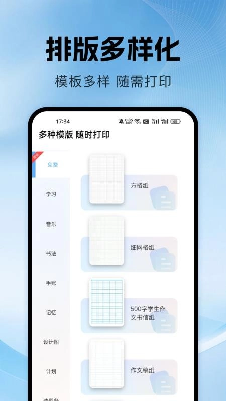 2、学习打印板块配备了丰富的专用模板库,像方格纸、田字格之类的模板一应俱全,能够满足特定的学习场景需求。