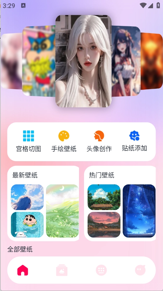 进入首页后,系统会为用户推荐海量的壁纸、头像和贴纸资源。