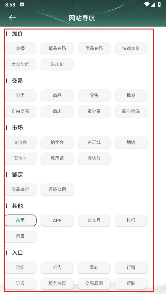 3、如图所示,设有交易、市场、鉴定等板块,您可根据自身需求点击相应板块,即可直接进入使用。