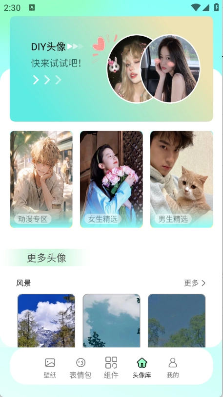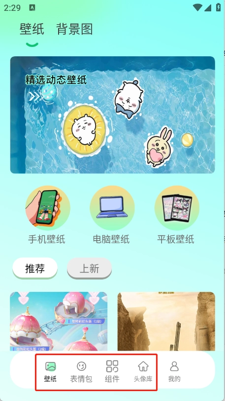 2、底部栏整合了壁纸、表情包、组件和头像这些板块。
