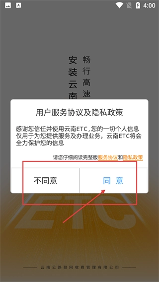 打开软件后,会弹出《用户服务协议及隐私政策》提示框,需仔细阅读并点击“同意”,方可继续使用软件功能。