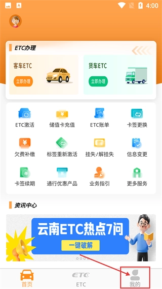 进入首页后,您可以办理【客车ETC】和【货车ETC】业务,也能使用【ETC激活】等功能,之后点击底部的【我的】按钮即可进入个人页面。