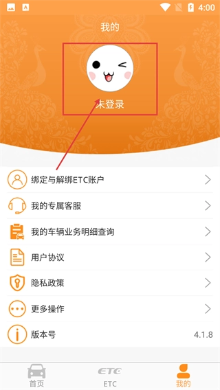 3、在个人页面,会显示【未登录】状态,此状态下可执行【绑定与解绑ETC账户】操作,点击头像区域即可进入登录流程。