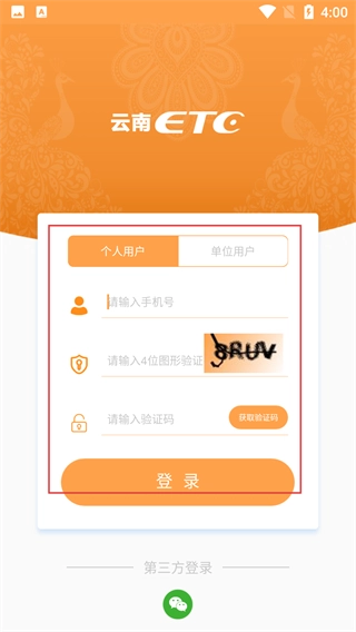 4、进入登录页面后,可选择【个人用户】或【单位用户】身份,输入手机号与短信验证码,点击【登录】按钮完成登录;此外,也支持通过微信第三方登录方式进行操作。