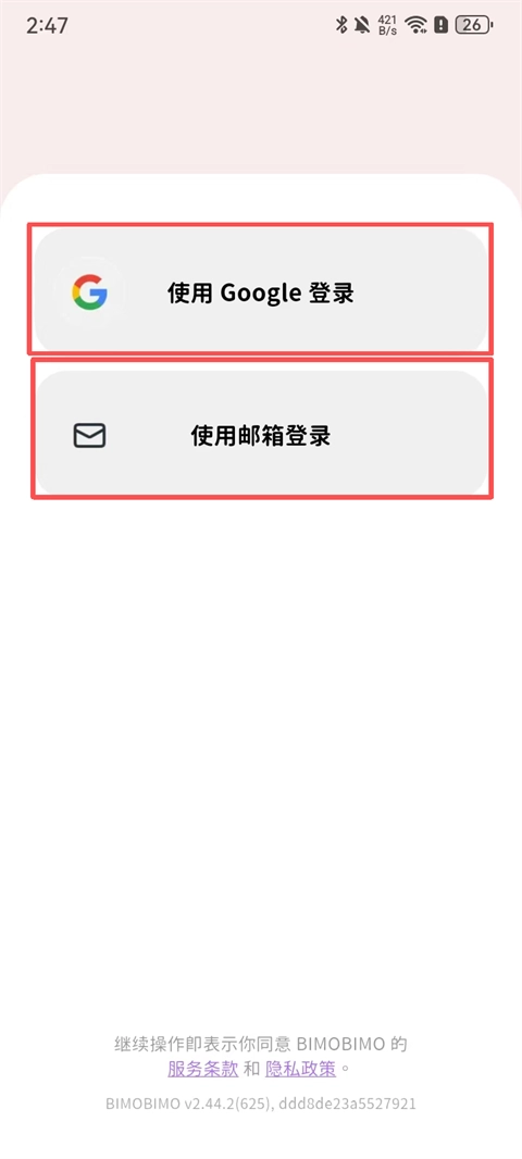 1、打开Bimobimo安卓版应用,该软件支持两种登录途径,分别是【谷歌账号登录】和【邮箱登录】;考虑到国内用户的使用情况,此次操作将以邮箱登录作为示例进行说明。