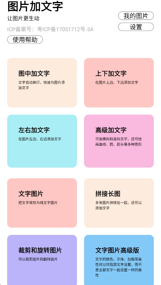 “图片加文字”是一款能帮你快速给图片添加文字的实用软件,界面简洁无繁杂广告。它功能丰富,不仅支持在图片上添加文字,还能制作纯文字图片,同时提供排版编辑、添加贴纸等多样化操作,几乎能满足你对图片添加元素的所有需求,欢迎有需要的朋友体验使用!
