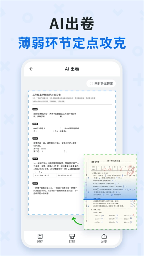 3、蜜蜂试卷能同时满足存储、导入、打印等多种需求,手机端操作简单方便,无论是在校学习还是居家复习,都能轻松适用。