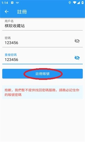 3、填写用户名和密码后点击“注册账号”按钮,就能完成注册流程。
