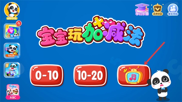 1、在“宝宝玩加减法”主界面,点击右侧带有音乐图标的功能按钮,即可进入学习乐园的内容选择页面。