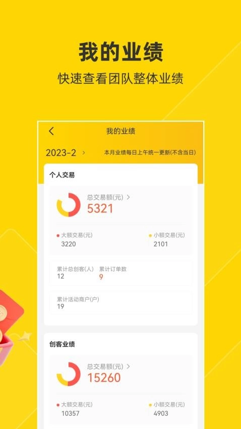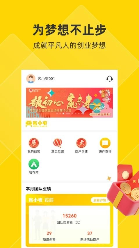 为创客群体打造了简洁易用的销售管理工具,支持用户详细记录并管理新增商户信息,通过创建商户功能让信息管理更便捷高效;同时便于随时查询交易明细、团队及个人业绩数据,助力用户实时掌握各项业绩动态,提升销售办公效率。