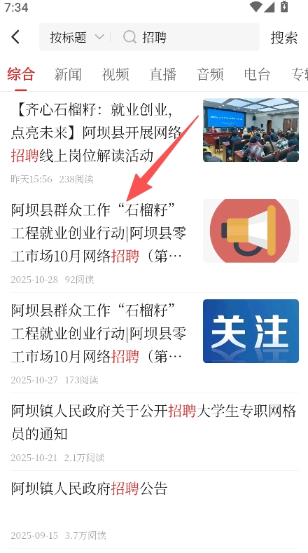 1、搜索功能支持关键词(例如“招聘”)检索,能够快速筛选出本地相关资讯,便于用户精准定位所需信息。