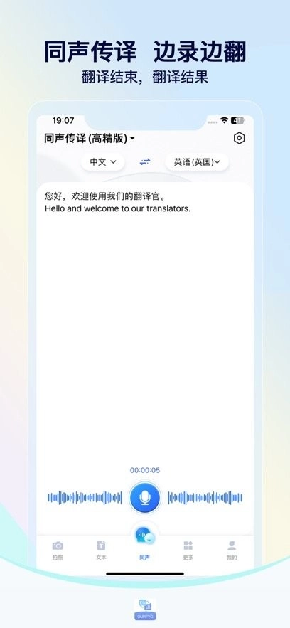 【同声传译】适配各类翻译场景,可达成边录制边将内容转化为文字的功能(支持中文与英文)