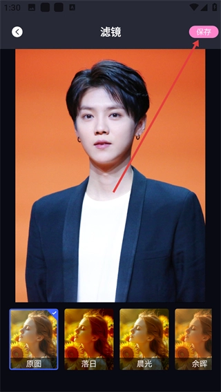 4、进入滤镜编辑页面后,你可以挑选【落日】【晨光】之类的滤镜效果,调整好参数后点击右上角的【保存】按钮,这样就能完成图片滤镜的编辑和保存操作了。