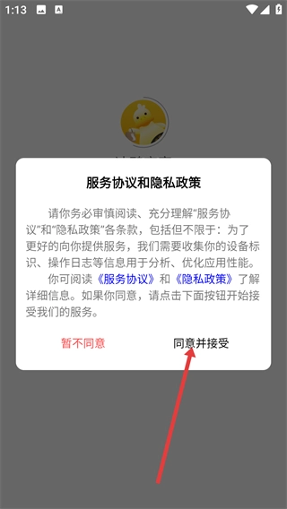 1、请先阅读【服务协议】与【隐私政策】,知悉其中关于信息收集及优化应用性能的相关规则,之后点击【同意并接受】按钮,即可进入应用的后续操作界面。