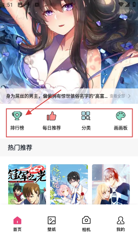 首页设有【排行榜】【每日推荐】等功能模块,点击【排行榜】既能浏览热门内容,也能通过分类筛选心仪内容,还可跳转至画画板进行创作。