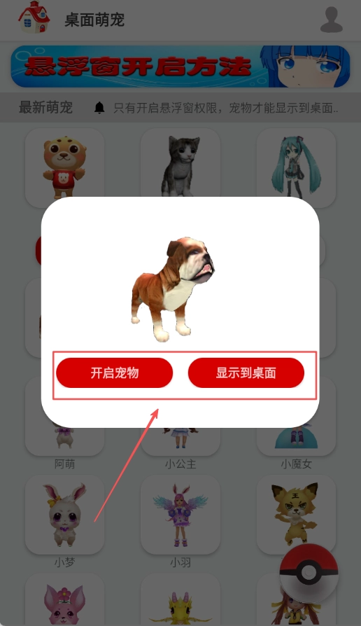 3、获取后点击开启宠物或显示到桌面的选项,选择合适的宠物展示方式,完成设置并将其应用到桌面进行展示。