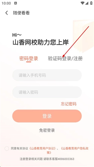 2、进入个人页面的登录界面后,点击“验证码登录/注册”选项,即可切换到验证码登录/注册界面。
