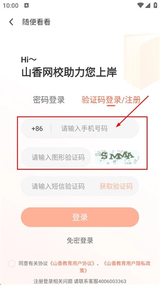 3、在验证码登录/注册界面,填写“请输入手机号码”对应的号码,以及对应的图形验证码。