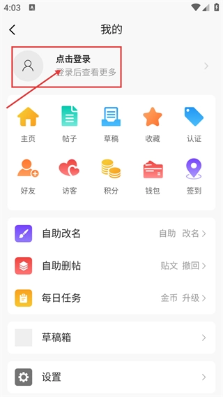 2、在包含主页、帖子等功能入口的“我的”页面中,点击顶部的“点击登录”区域,即可进入登录选择界面。