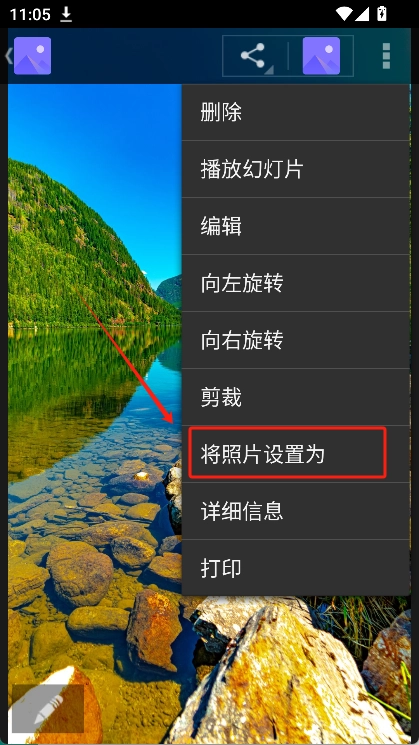 7、点击右上角的“三个点”图标,接着选择“将照片设置为”选项,这样就能把照片设为手机壁纸了。