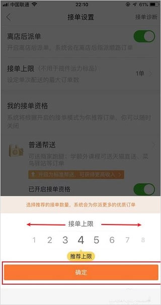 4、左右滑动选择接单上限数量后点击确定,建议先设置为2单试试,不要一开始就接太多,要是忙不过来还是会扣钱的。