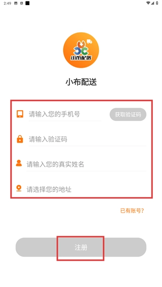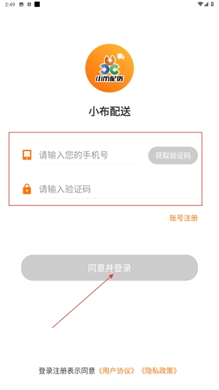1、在【小布配送】的登录页面,先输入手机号,接着获取并填写验证码,之后点击【同意并登录】按钮完成账号验证,即可进入应用。