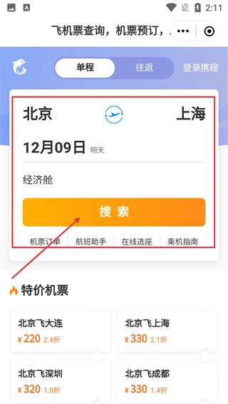 3. 进入机票查询页面后,先选择行程类型(单程或往返),接着填写出发地、目的地以及出行日期,确定好舱位后,点击【搜索】按钮即可。