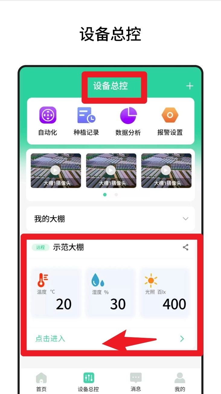 3. 点击设备总控进入设备管理页面,在这个页面中,你能够查看所有设备的相关信息,像温度、湿度、光照这类数据都可以看到。