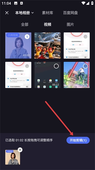 2、在本地相册界面挑选要剪辑的素材,选好后点击“开始剪辑”按钮,就能进入视频编辑界面。